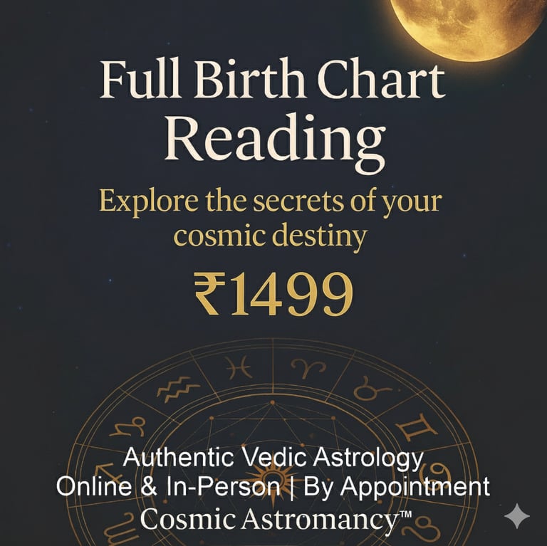 Get a complete insight into your life’s blueprint — covering career, marriage, health, wealth, and destiny. A detailed reading based on your Vedic birth chart to reveal strengths, challenges, and timing of key life events.