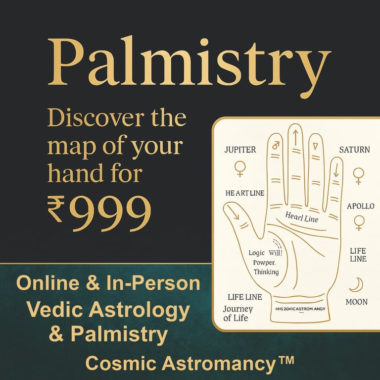 Through detailed Palmistry Consultations, gain insight into your life path, relationships, career, and future possibilities.
